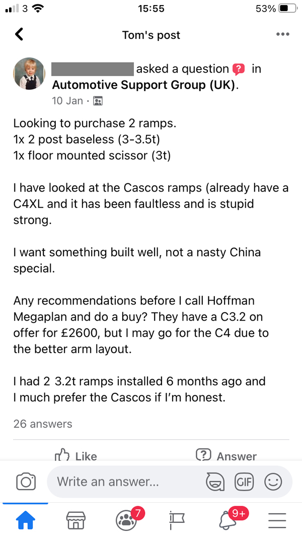 However, we are pleased to say that having done that research, the customer eventually came back and purchased an additional Cascos baseless 2 post lift, as well as a Hofmann Megaplan full-height scissor lift.